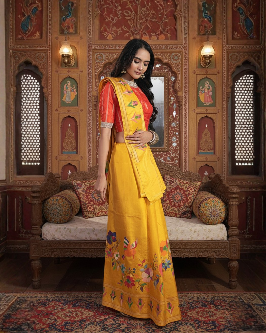 Gujarat celebrates Makar Sankranti as Uttarayan, a festival that spills onto rooftops and terraces as skies fill with kites in brilliant motion. The energy is infectious, social, and exuberant. Sarees chosen for Uttarayan reflect this celebratory spirit… bright hues, lightweight fabrics, and expressive pallus that move freely with the body. These drapes balance festivity with practicality, allowing for movement while retaining visual drama. Tradition here is playful, alive, and joyously communal.