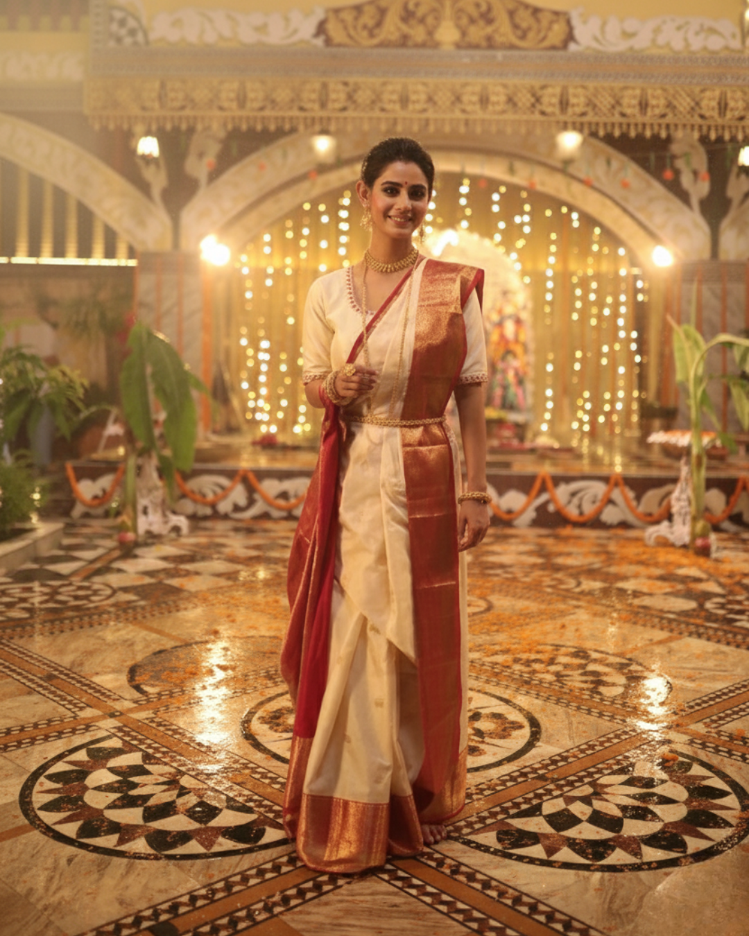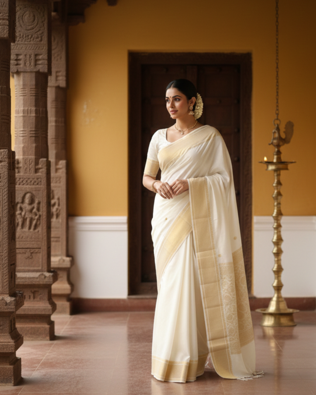 In Kerala, the Sankranti period aligns with Makara Vilakku, closely associated with the Sabarimala pilgrimage. Attire during this time reflects restraint and devotion. White and off-white sarees, often edged with subtle gold borders, dominate… symbols of purity, discipline, and spiritual focus. These understated drapes echo the contemplative mood of the season, where faith takes precedence over adornment.