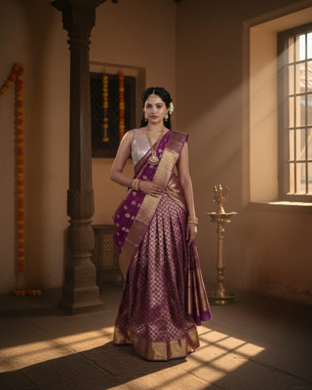 In Tamil Nadu, Pongal is a sacred expression of thanksgiving. Homes are cleansed, kolams bloom at thresholds, and temples become the heart of celebration. Women traditionally wear silk sarees in auspicious shades… golden yellows, deep reds, luminous greens… each symbolising renewal and prosperity. With their ceremonial weight and radiant texture, these silks align seamlessly with the spiritual cadence of the festival, embodying reverence as much as celebration.