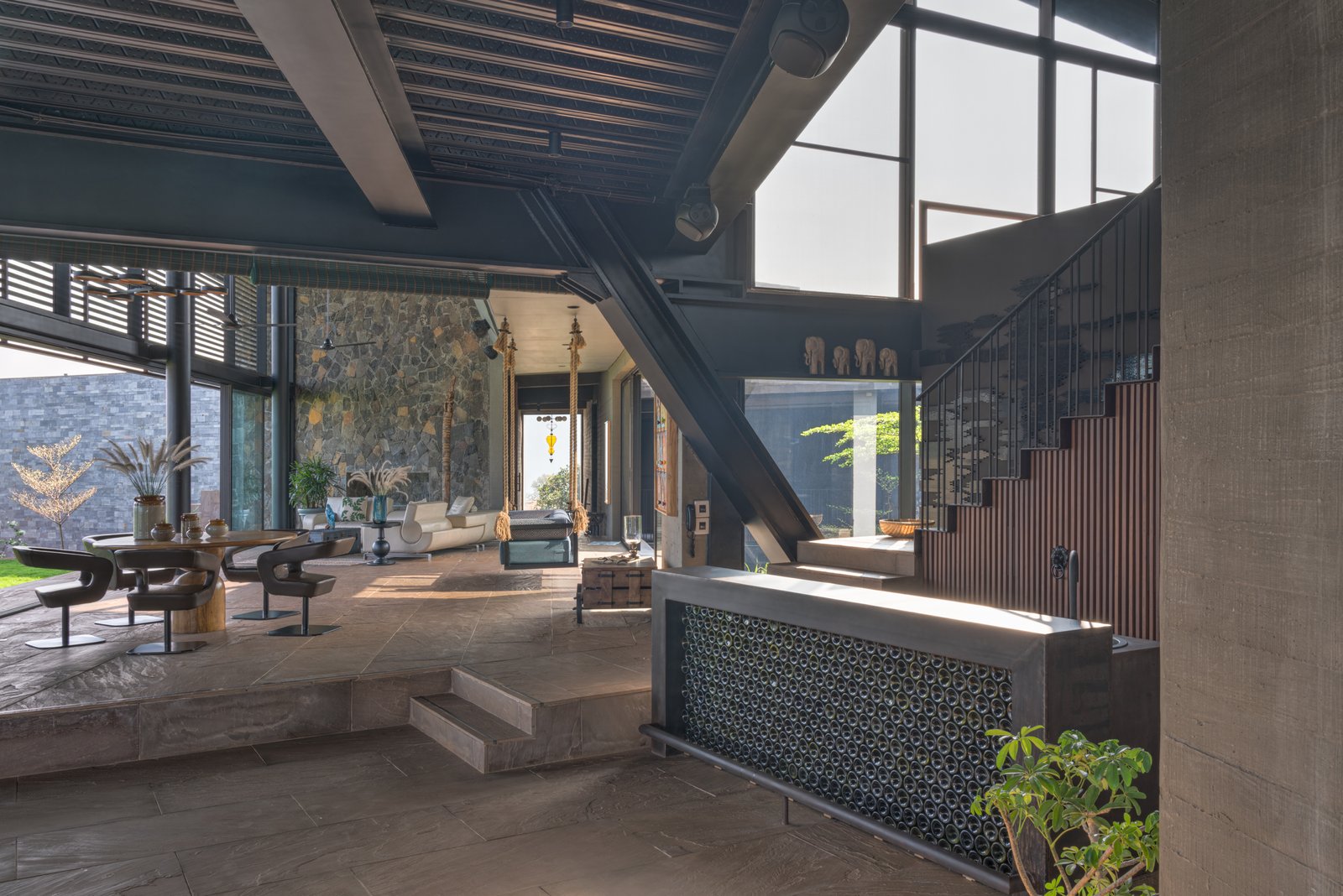 We incorporated natural ventilation and passive cooling strategies so the home remains comfortable with minimal reliance on artificial systems. The design itself was guided by the philosophy of staying connected to nature and to one another. No matter which room you are in, you get a framed view of the surrounding landscape. I planted large trees within the home, creating a green spine that ties the spaces together and keeps the family connected, even across such a large structure.