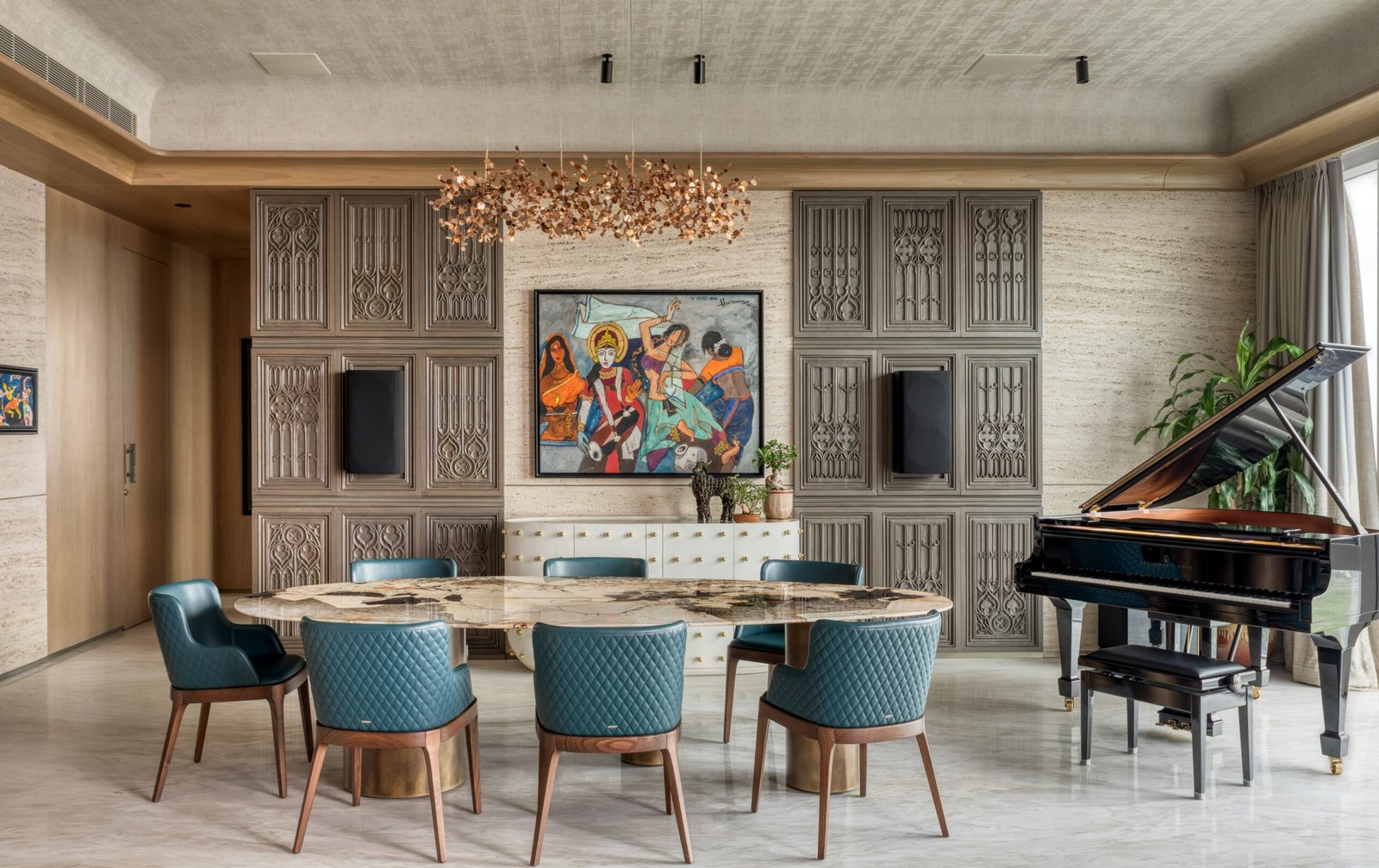 Shriram had an extensive team and it truly took collective inputs from everyone involved to bring the house to life. With several challenging aspects from the intricate sound system to sound cushions on all the walls, we had to collaborate closely with multiple consultants to ensure every technical element blended seamlessly into the overall design. Achieving that level of integration was, I believe, the quiet victory of the project- and truly a team effort.
